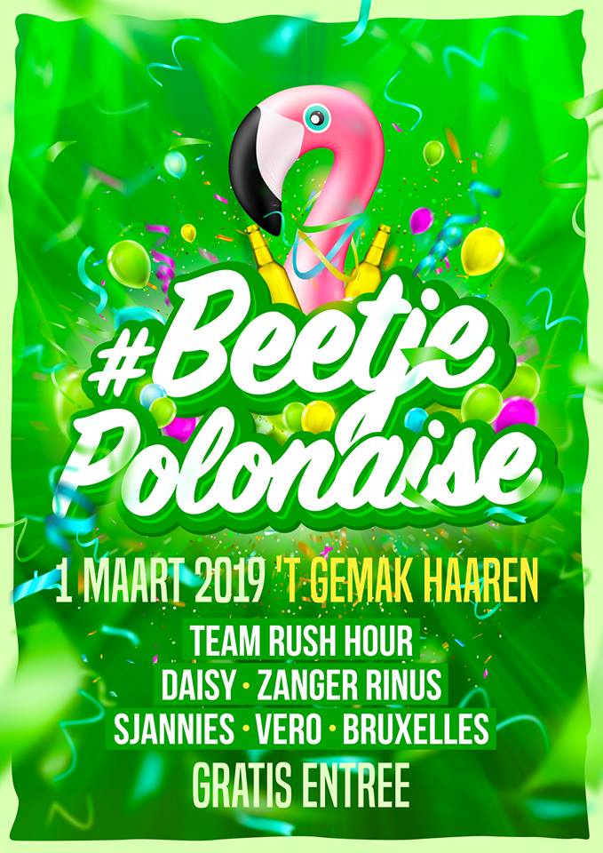 Ja hoor, je ziet het goed! We trappen carnaval 2019 af met #BeetjePolonaise – gratis entree!️ Zo lekker ben je je carnaval nog nooit begonnen! Slinger jezelf in je meest heerlijke carnavalsoutfit en kom samen met ons dansen of je leven er vanaf hangt! En hebben jullie die line-up gezien mooie mensen? Met niemand minder dan; Team Rush Hour, Daisy, Zanger Rinus (jawel de enige echte), SJANNIES, Vero en Lanx & Bruxelles trekken we alles uit de kast voor de meest hete polonaise ooit!