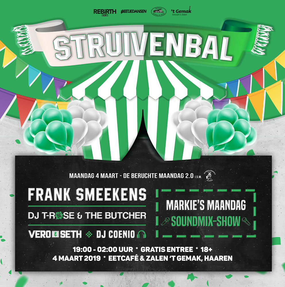 STRUIVEN & STRUIVINNEN, Het is tijd voor het programma van misschien wel de allermooiste dag van de carnaval… DE BERUCHTE MAANDAG! Ook dit jaar zijn de mannen van CV De Bartelkwartels er weer bij om samen met jullie de maandagavond traditiegetrouw om te dopen tot een groot mega gezellig feest! Bij Ine & Christ ist altij fist zeggen ze.. Nou dit jaar zijn zij d’r natuurlijk ok wir bij, en nog wel op d’n Haarendijk! We starten de De Beruchte Maandag 2.0 met 2 Haarense grootheden die de maandagavond vorig jaar grandioos opende: T-Rose Bart Roozen & The Butcher Jan-peter Van de Wiel, trappen af met heerlijke ouderwetse carnavalskneiters. Feest-DJ Coenio zal het stokje hierna overnemen en de polonaise op grootse wijze voortzetten. Hij stond in zijn 25 jarige carrière op bijna alle grote Nederlandse festivals, en is dus DE aangewezen persoon om de maandagavond tot ontploffing te komen brengen! Hij is ondertussen niet meer weg te denken in het Haarense tijdens carnaval.. Deze man heeft de grootste hit ooit en maakt dit jaar dan eindelijk zijn debuut tijdens De Beruchte maandag.. KEKT ZE LOPEN BLOUSKE WIJD OPENNNNN Frank Smeekens!!!