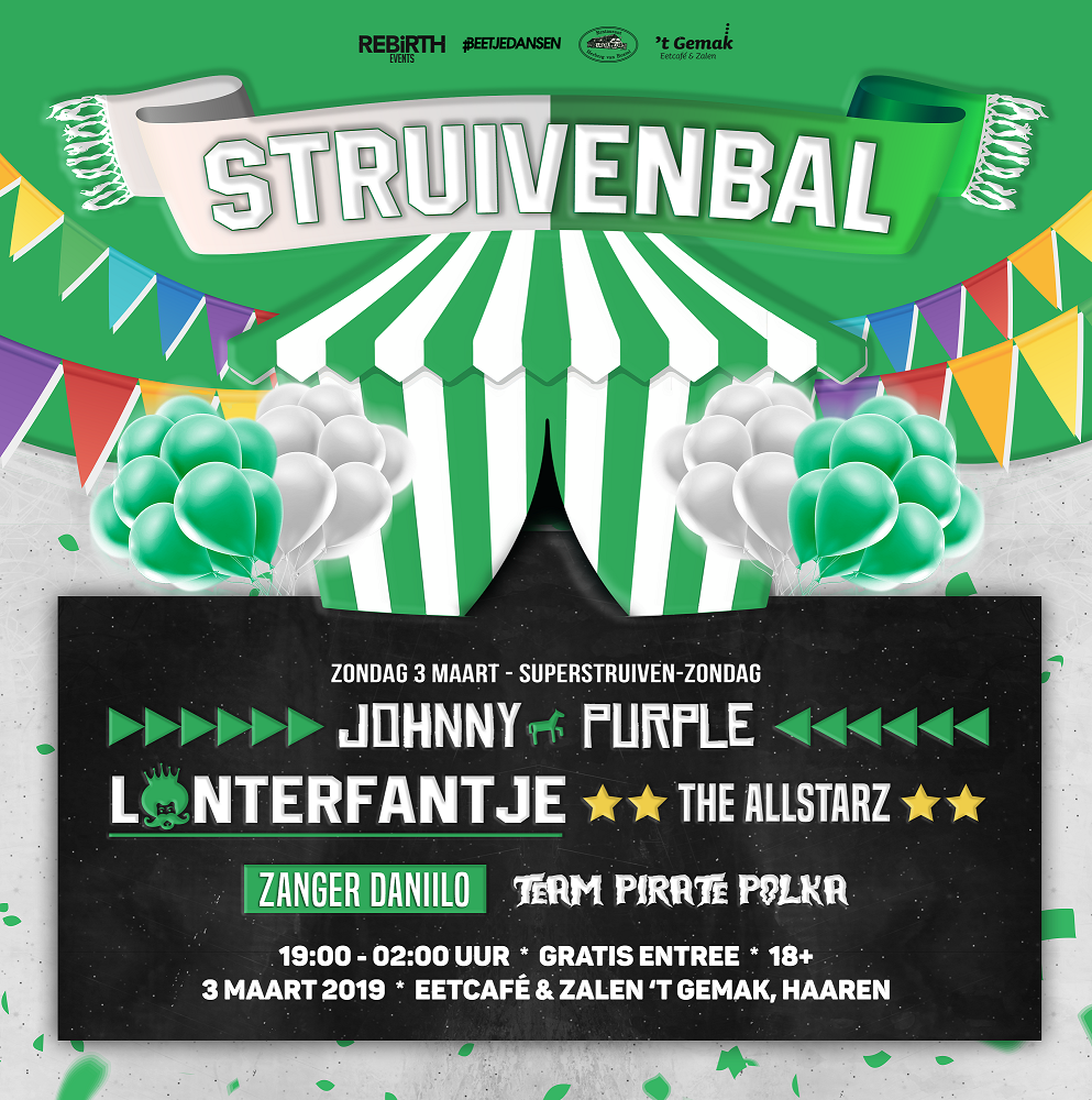 We gaan door met het schitterende programma van de zondag van het Struivenbal 2019! Alle Porseleinen Pony’s verzamelen! Johnny Purple neemt zijn kneiter van een hit mee richting Haaren! Hij zal er samen met jullie een groot groen-wit feest van komen maken! Groen- wit feest hoef je onze Haarense volgzanger Zanger Daniilo & Team Pirate Polka niet uit te leggen, ook deze lokale helden zijn dit jaar weer aanwezig! Zeg je Struivenbal dan zeg je LanterFantje, deze Tilburgse vrienden komen alweer voor het 3e jaar met Carnaval naar Haaren: 100% feest gegarandeerd!