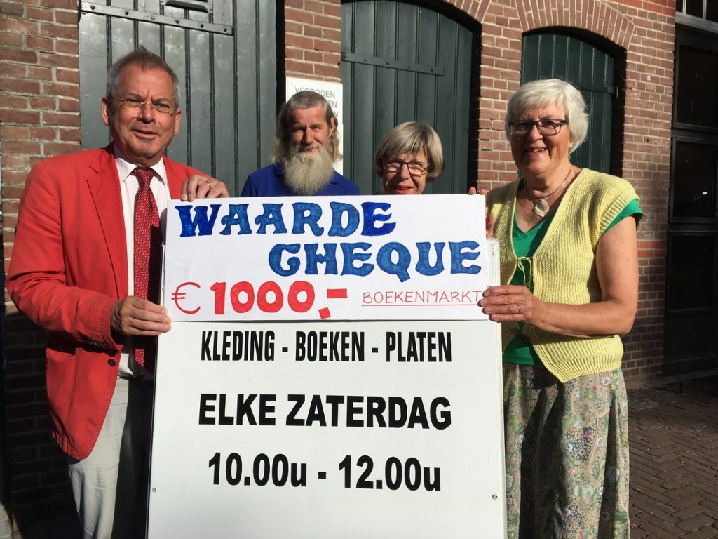 Zaterdag 13 oktober overhandigde de Boekenmarkt de opbrengst, duizend euro, aan voorzitter Arjen Witteveen van de Voedselbank (links op de foto) in de vorm van een symbolische waardecheque. “We kunnen het geld prima gebruiken”, zegt Arjen Witteveen. “Nog niet zo lang geleden zijn we verhuisd naar een pand in de Achterberghstraat in Boxtel. “Met zo’n verhuizing zijn altijd de nodige kosten gemoeid.”