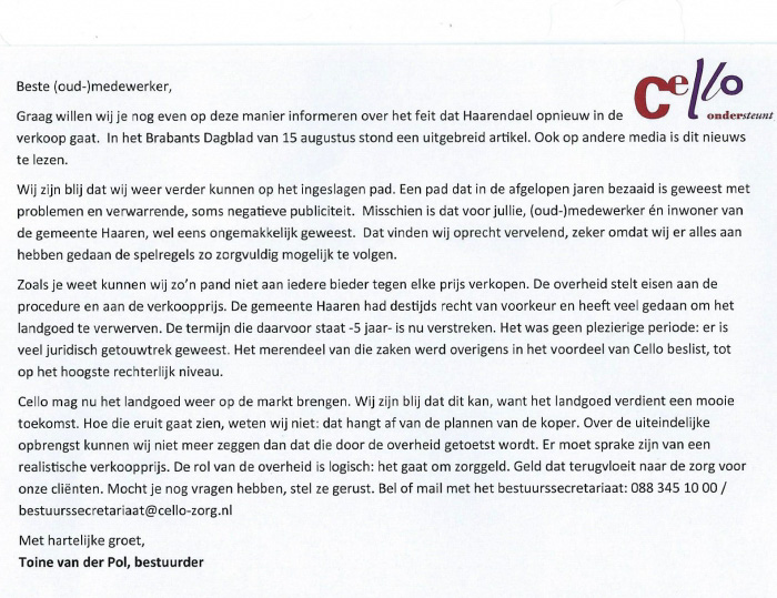 Zorgaanbieder Cello gaat het veelbesproken landgoed Haarendael deze week opnieuw te koop aanbieden. Na het verstrijken van termijnen die de WVG (Wet Voorkeursrecht Gemeenten) stelt, is vrije verkoop nu mogelijk. Partijen die in het verleden hun belangstelling hebben getoond voor het pand worden door Cello op de hoogte gebracht van het proces. Andere belangstellenden kunnen zich melden bij het Bestuurssecretariaat.