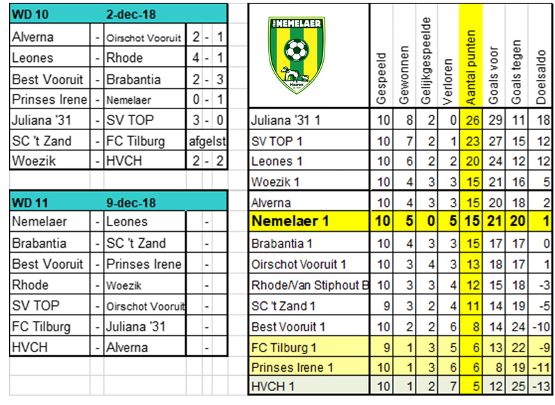 HAAREN – 2 december De promovendus uit Nistelrode sprokkelt met moeite de punten bij elkaar. Nemelaer probeert de 7-1 ouverture van vorige week een goed vervolg te geven. Nemelaer is de eerste helft oppermachtig. Joeri Vugts kan al binnen een paar minuten de score openen door een voorzet van Gijs van Baast van dichtbij binnen te tikken. Ook Giel vd Ven weet uit een 1-op-1 situatie met de doelman niet te scoren. Uit een van de vele hoekschoppen is het raak. Daan vd Brand kopt snoeihard binnen op aangeven van Gijs. 0-1 (27). In het restant van de 1e helft weet Nemelaer nog een paar dotten van kansen te creëren echter doelman van Venrooij houdt zijn team in de race. De gastheer weet voor de thee geen enkele kans te creëren terwijl Nemelaer zichzelf te kort doet door niet fiks uit te lopen.