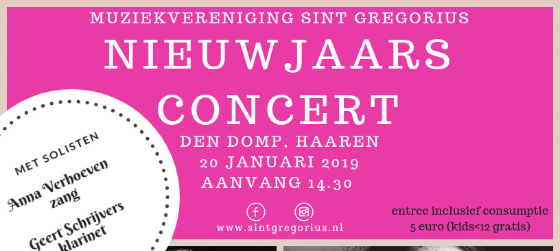 HAAREN – 6 januari. Op zondag 20 januari 2019 vindt het nieuwjaarsconcert van Muziekvereniging Sint Gregorius plaats. Traditiegetrouw in Den Domp in Haaren, aanvang 14.30 uur (kaarten zijn verkrijgbaar bij Den Domp, Op je Best en aan de kassa, kinderen gratis).