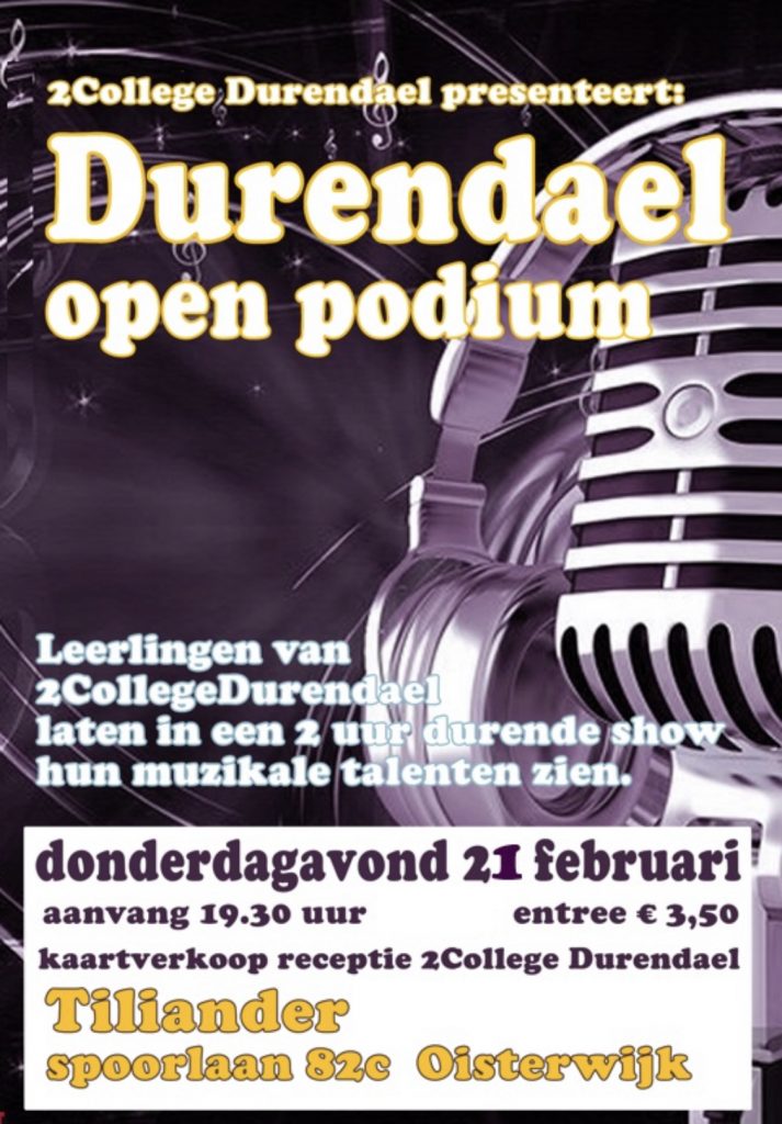 Op donderdag 21 februari bent u van harte welkom bij het Open Podium van Durendael in Tiliander. De show begint om 19.30 uur. Het open podium is een initatief van BLACK, de Buiten Les Activiteiten Commissie van Durendael.