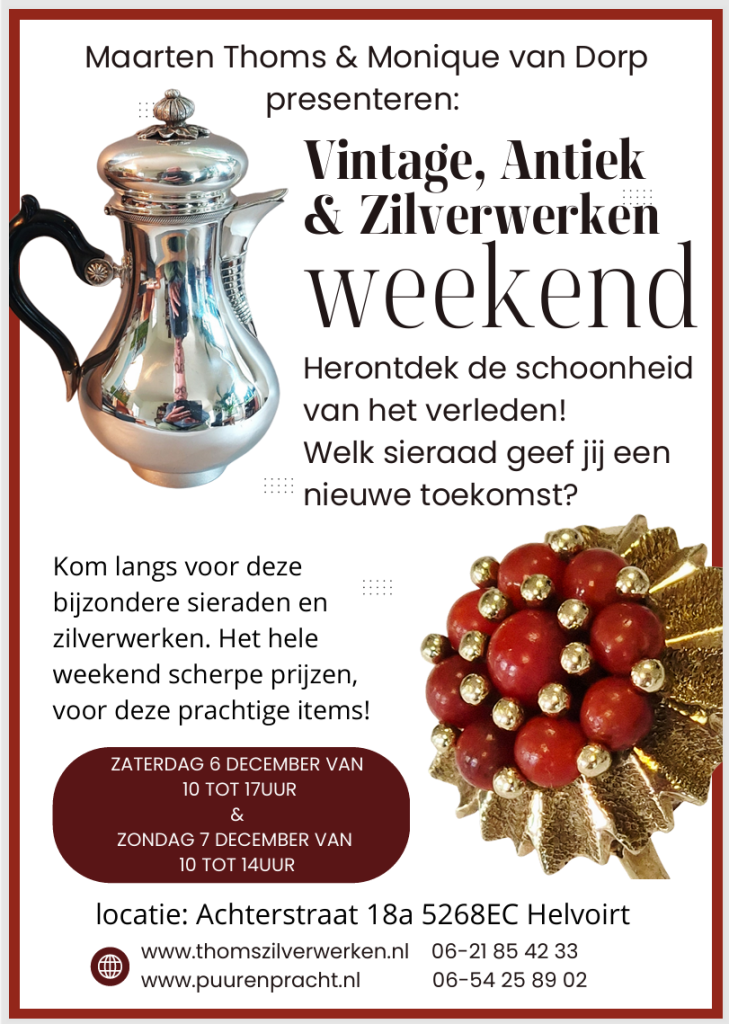 Kom langs voor deze bijzondere sieraden en zilverwerken. Het hele weekend scherpe prijzen, voor deze prachtige items!   Achterstraat 18a 5268EC Helvoirt