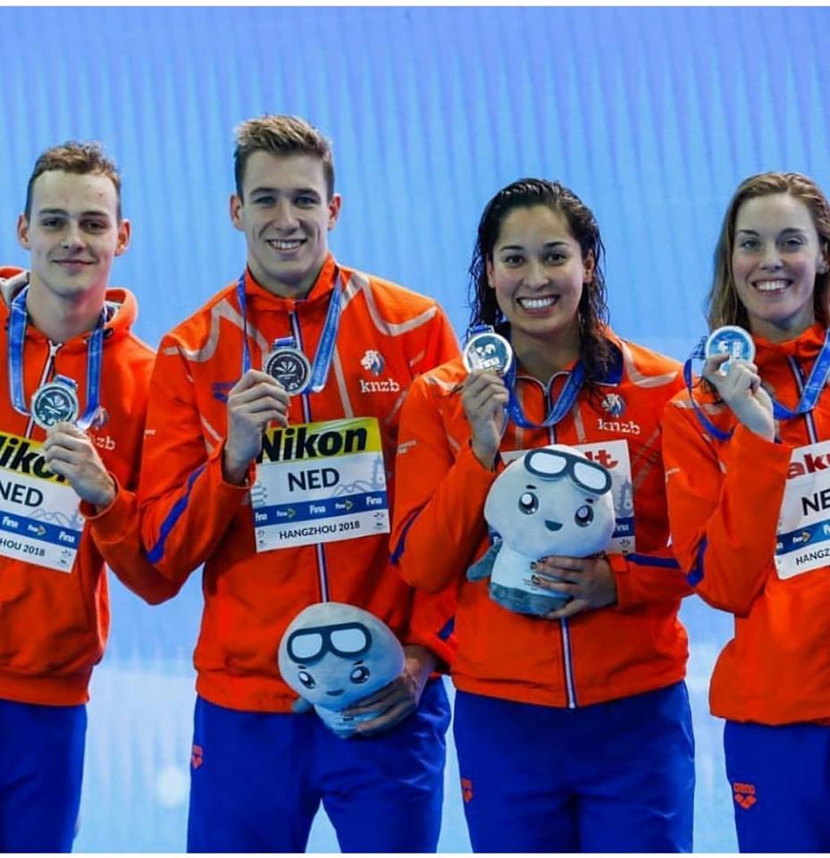 Na de 4×50 estafette mixed oogde Stan Pijnenburg blij met het zilver om zijn nek. ‘’Voor dit onderdeel ben ik hier gekomen. Dat ik dan een bijdrage heb kunnen leveren was mooi.’’ Pijnenburg (21,18) was kritisch over zijn overname van startzwemmer Jesse Puts. ‘’Die was niet al te best.’’ Puts opende (21,17) in zijn beste seizoenstijd. ,,Superblij hiermee. We hadden in Windsors twee jaar geleden ook zilver en nu weer. Die tijd geeft me veel vertrouwen naar de individuele vijftig vrij.’’ Kromowidjojo (23,09) bracht het kwartet van een zevende naar een derde plaats, waarna Heemskerk (23,07) de tweede plek voor Rusland (1.28,73) veilig stelde. In de series namen Kim Busch en Valerie van Roon de plekken in van beide vrouwen.